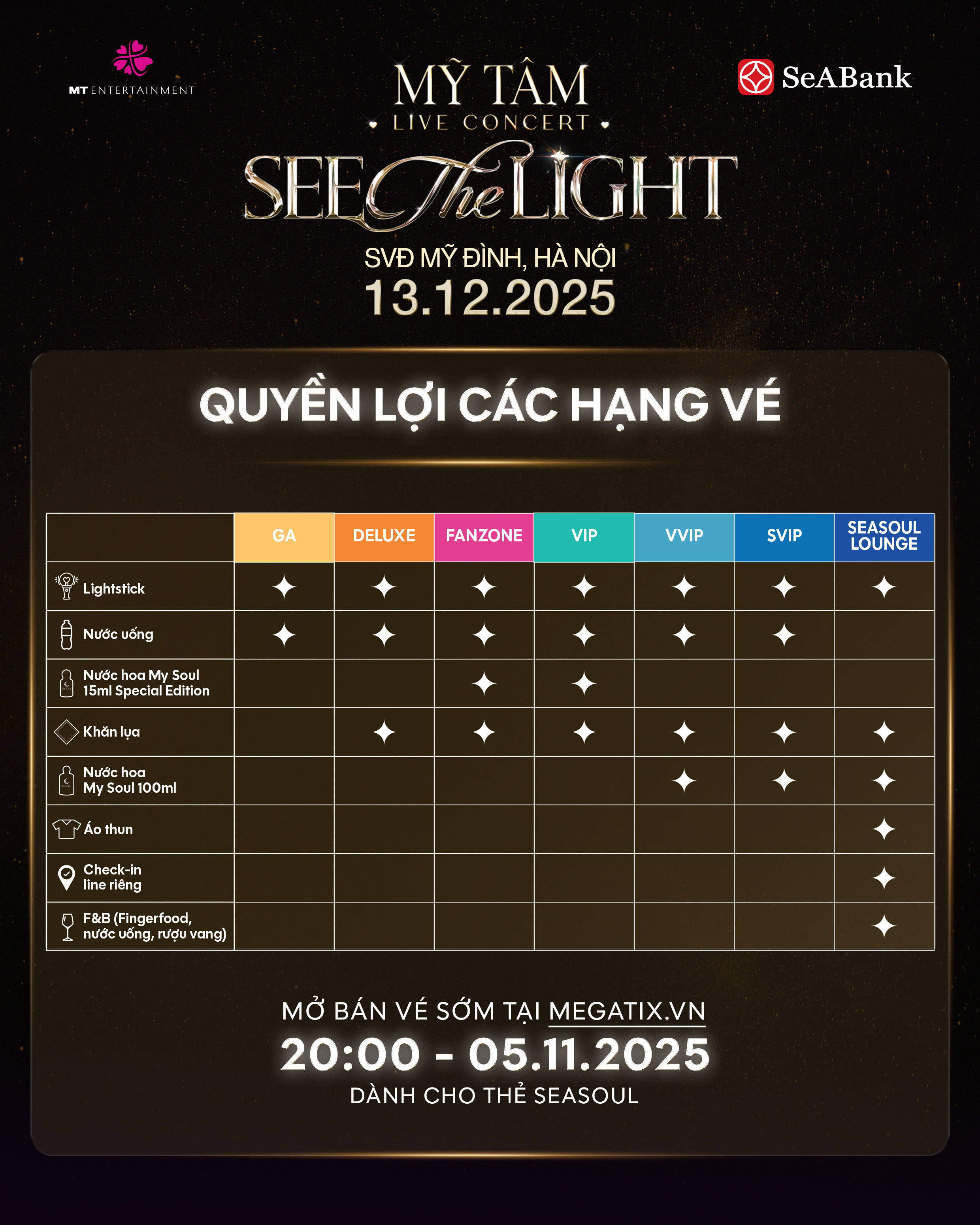 Vào ngày 13/12/2025, Live Concert của Mỹ Tâm sẽ chính thức diễn ra tại Sân vận động Mỹ Đình, Hà Nội. Đêm concert có quy mô lên tới 40.000 khán giả, hứa hẹn trở thành một trong những sự kiện âm nhạc đáng mong chờ nhất năm. Vé của chương trình sẽ được mở bán chính thức từ 20h ngày 5/11/2025, dự kiến tạo nên “cơn sốt” săn vé trong cộng đồng người yêu nhạc trên cả nước.